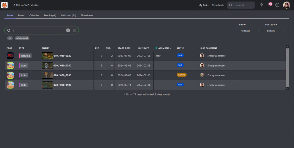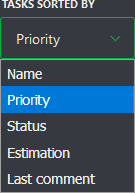 - Under the Sorted By dropdown, you can sort tasks by Name, Priority, Status, Estimation, or Last Comment.